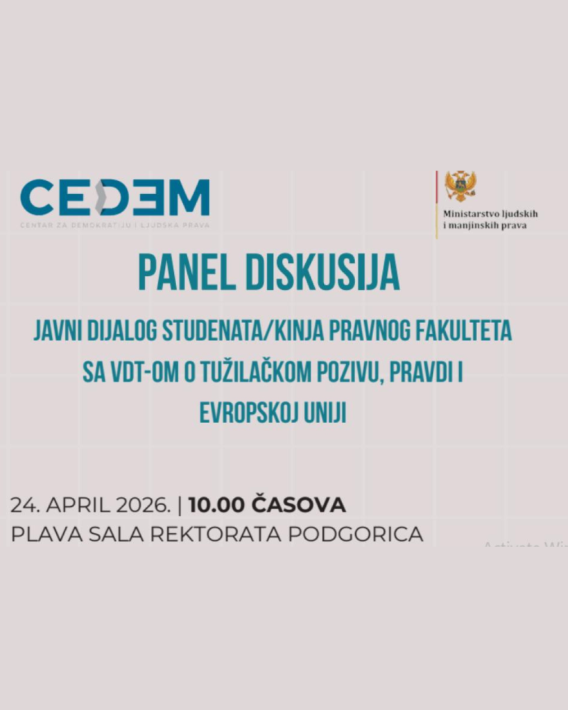 Centar za demokratiju i ljudska prava (CEDEM) poziva studente/kinje Pravnog fakulteta Univerziteta Crne Gore na Javni dijalog studenata/kinja sa Vrhovnim državnim tužiocem o tužilačkom pozivu, pravdi i Evropskoj uniji.